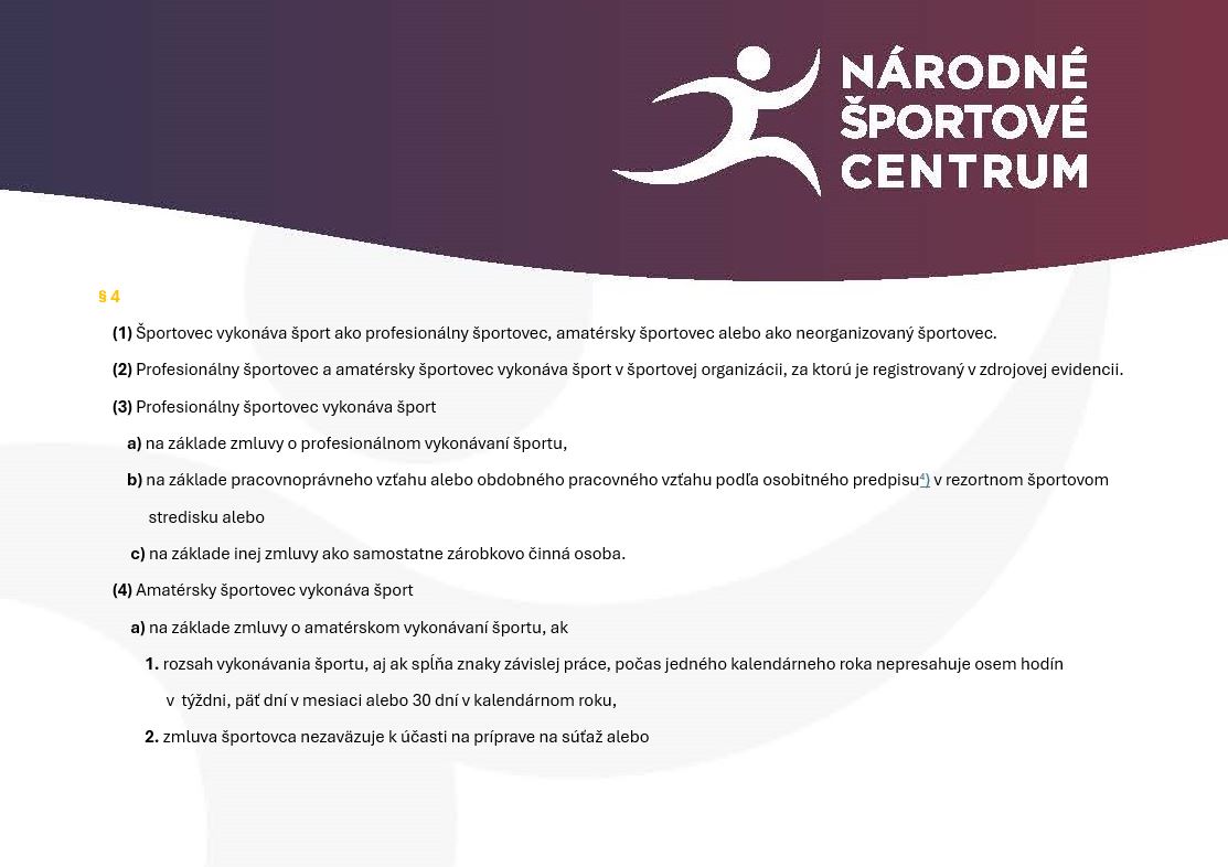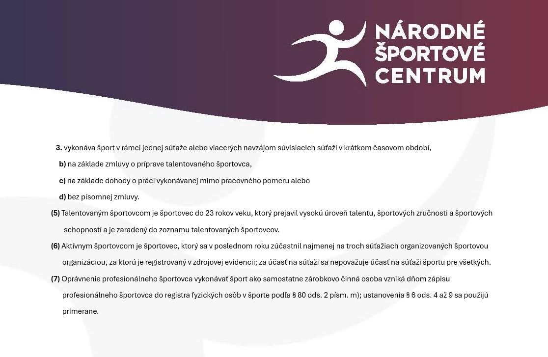 Zákon č. 440/2015 Z. z. o športe v Slovenskej republike má široký záber a myslí na všetko a všetkých čo sú spojený so športom. Do uvedeného zákona patrí aj športovec, ktorý je jeho neoddeliteľnou súčasťou.
